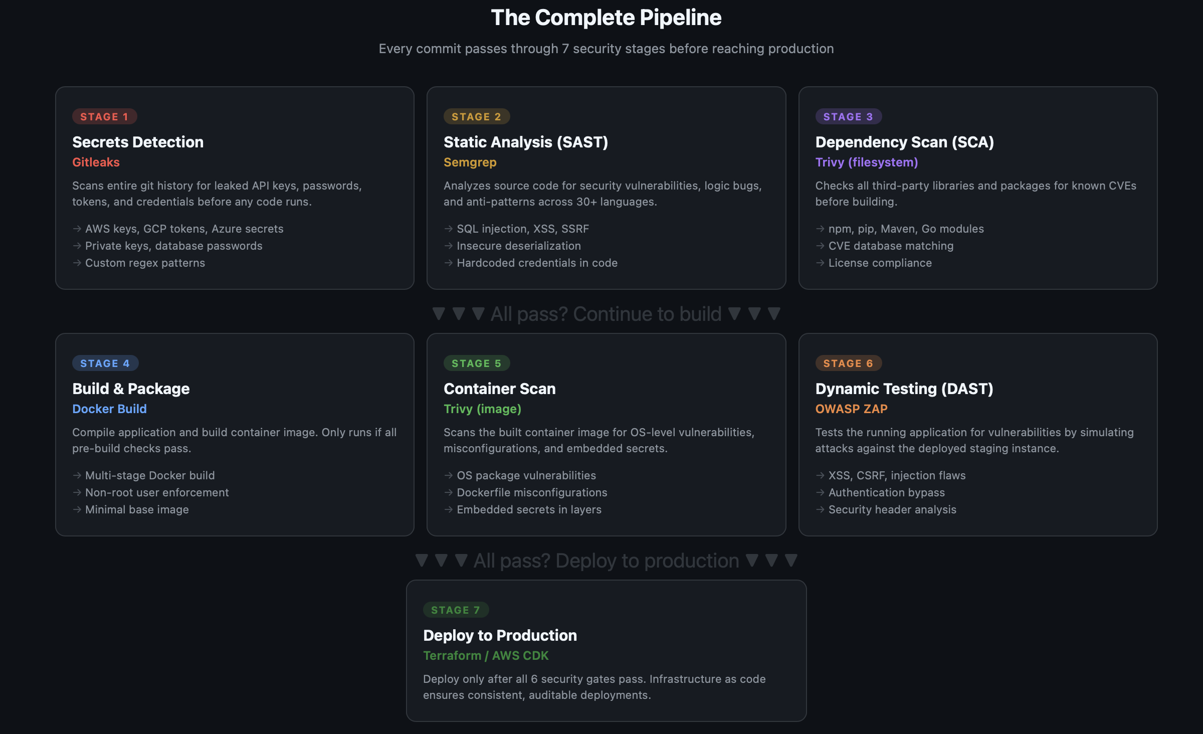 7 stages. 5 open-source tools. Every commit scanned for secrets, vulnerabilities, and misconfigurations before it touches production. Here's the complete blueprint — fork the workflow and deploy it today.