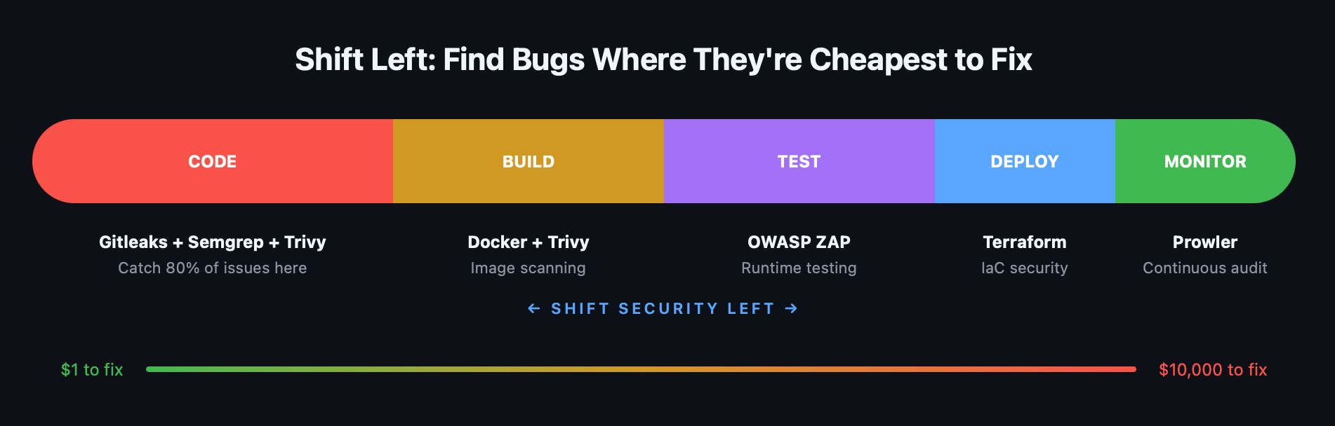 Real DevSecOps bakes security checks into every commit, every pull request, every build. The developer gets feedback in minutes, not months. And with the right tools, the entire thing costs $0 in licensing.