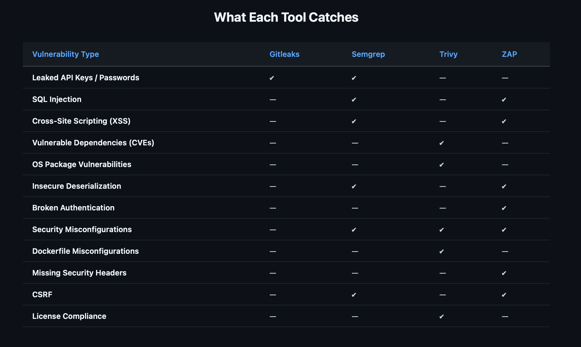 Semgrep and ZAP have the most overlap (both catch injection flaws), but they find them differently — Semgrep through code patterns, ZAP through runtime behavior. A finding caught by both is almost certainly real.