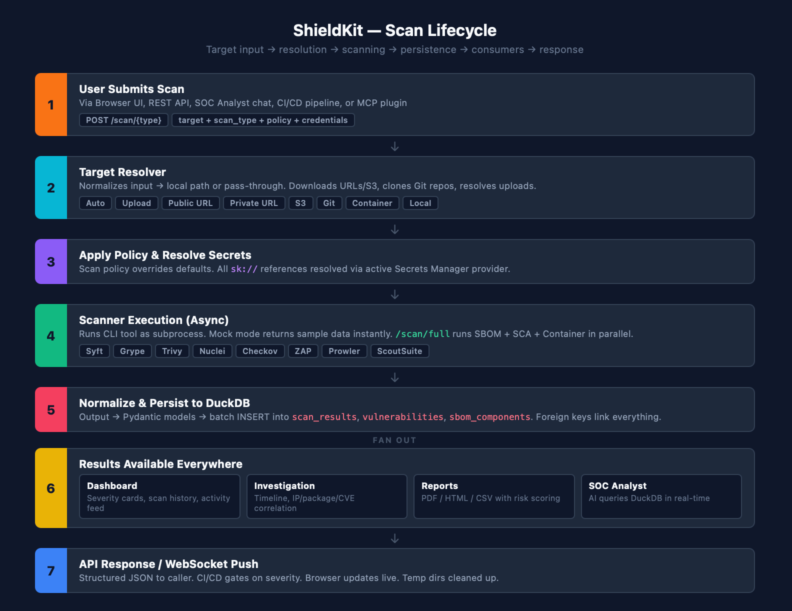 ShieldKit uses DuckDB — embedded, zero-config, runs in-process, handles analytical queries on millions of rows without needing a cluster. Every scan result, vulnerability, SBOM component, cloud finding, and log entry sits in the same database with proper foreign keys.