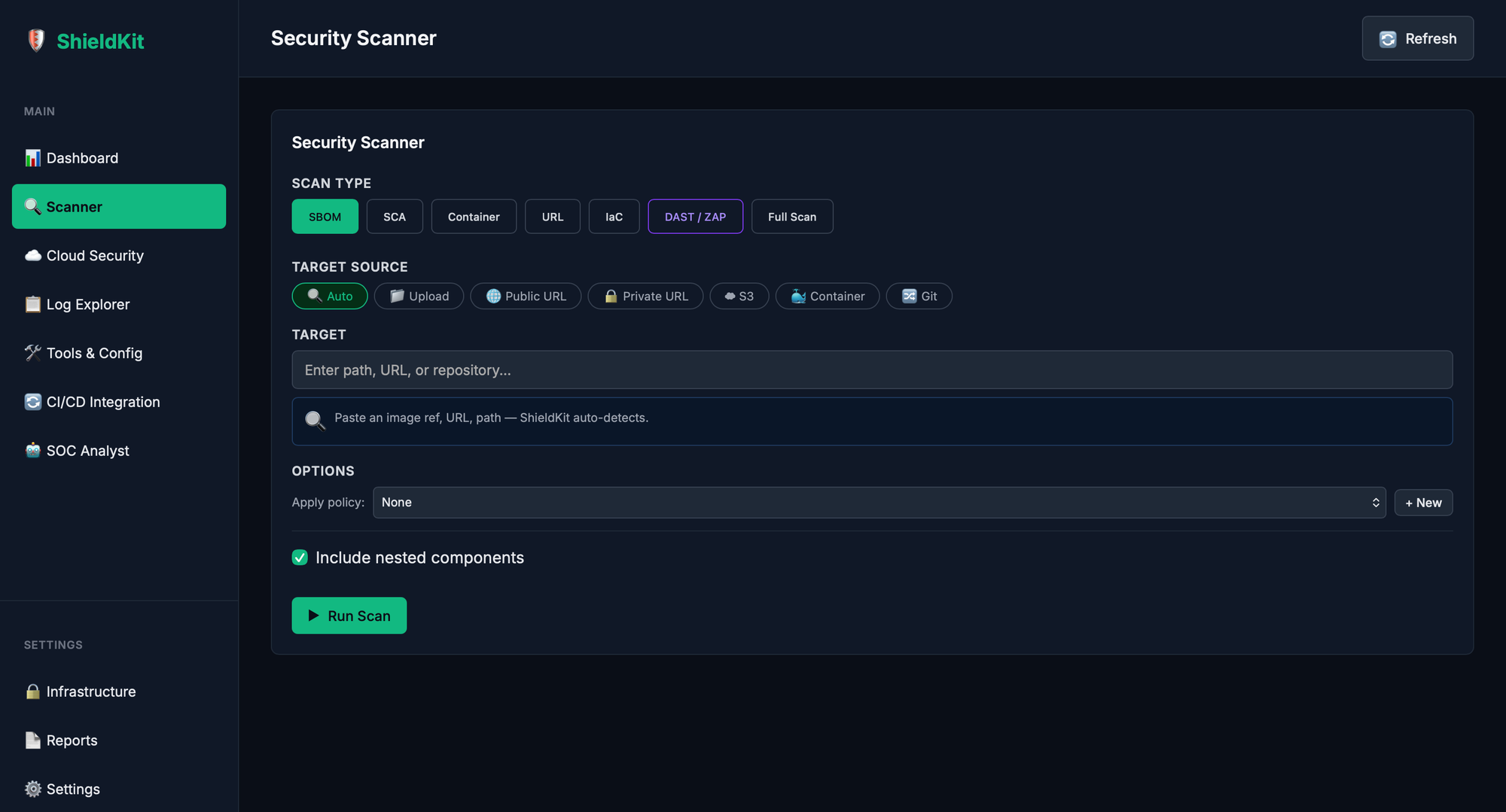 Most tools accept exactly one input type — a Docker image name or a local path. Helpful. ShieldKit's Target Resolver accepts eight: auto-detect, file upload, public URL, private URL with auth, S3 URI, Git repo (with token injection for private repos), container image, and local path.