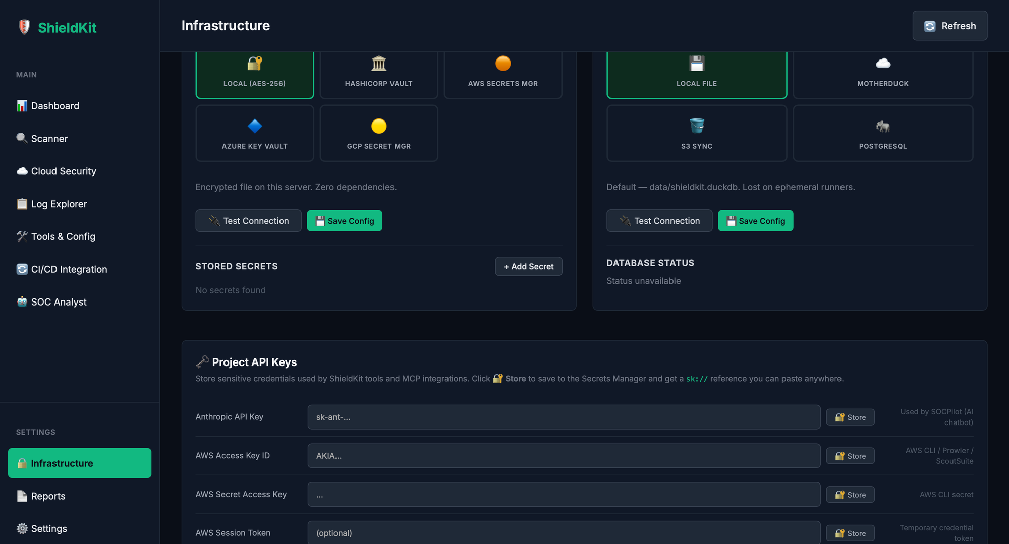 Single-file SPA. No React. No webpack. No node_modules. Ten tabs: Dashboard, Scanner, Cloud Security, Log Explorer, Tools & Config, CI/CD Integration, SOC Analyst, Infrastructure, Reports, Settings. Everything over HTTP and WebSocket to the FastAPI backend.