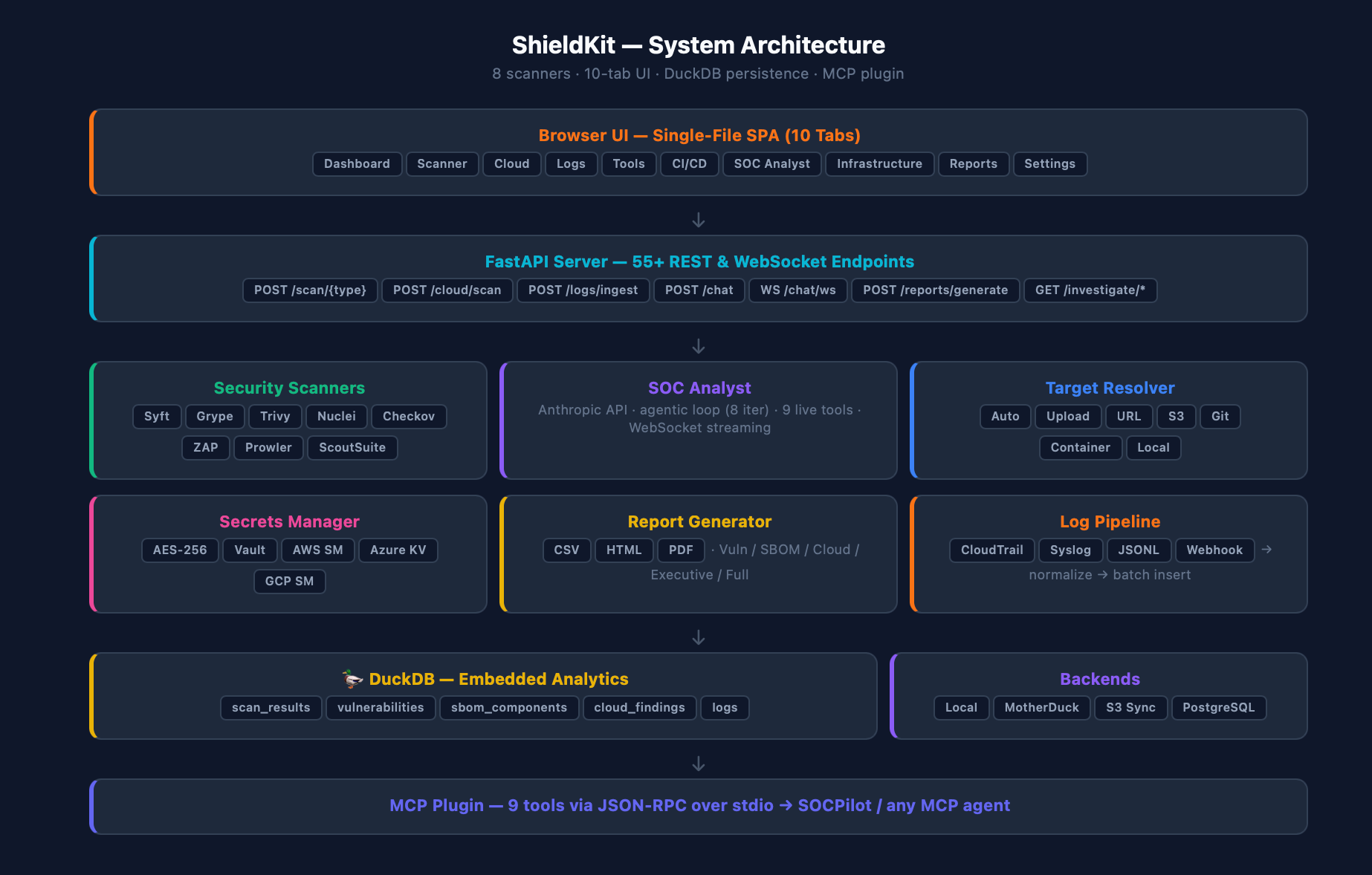 Browser UI → FastAPI (55+ endpoints) → 8 scanners + services → DuckDB + MCP plugin.