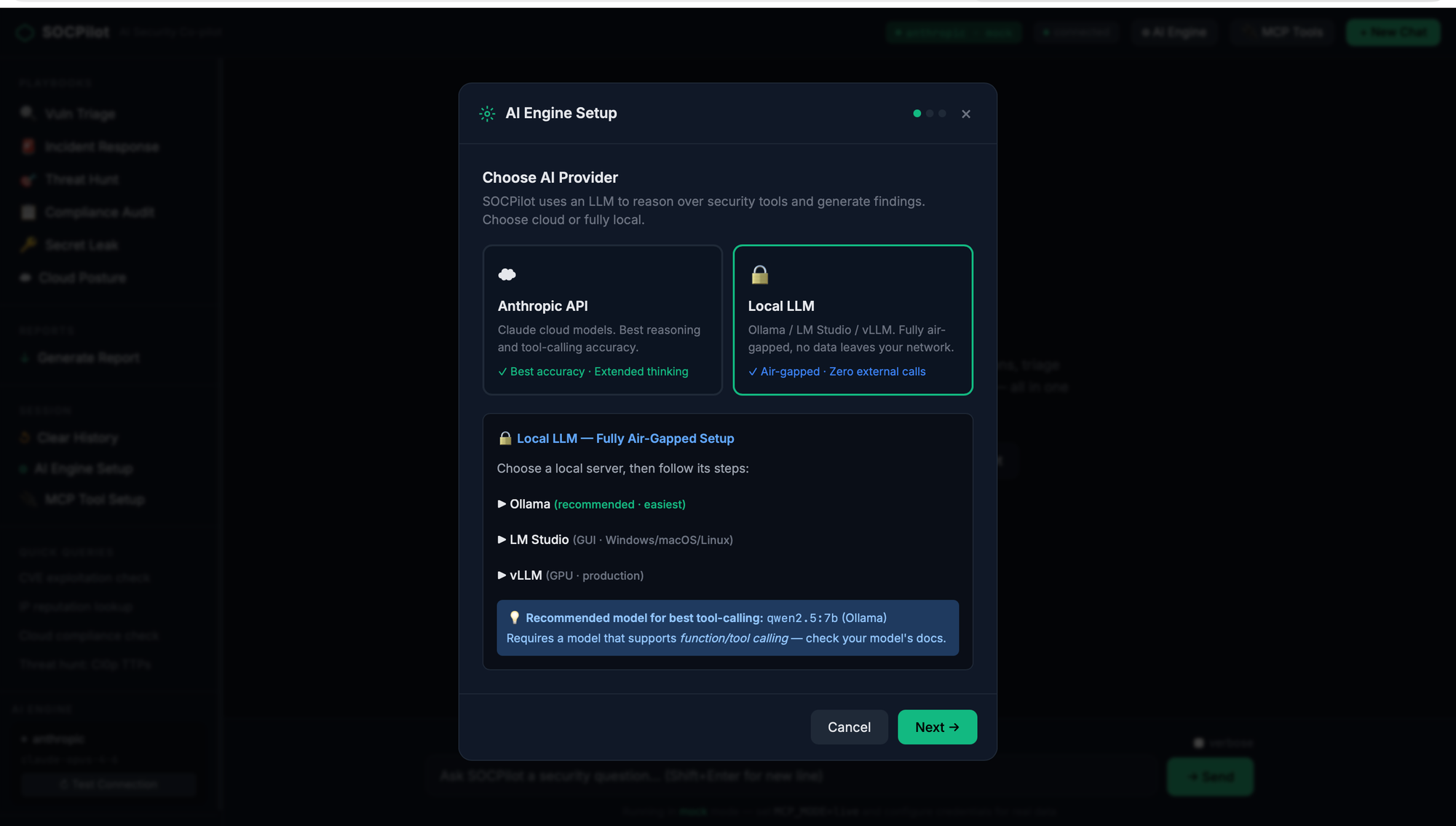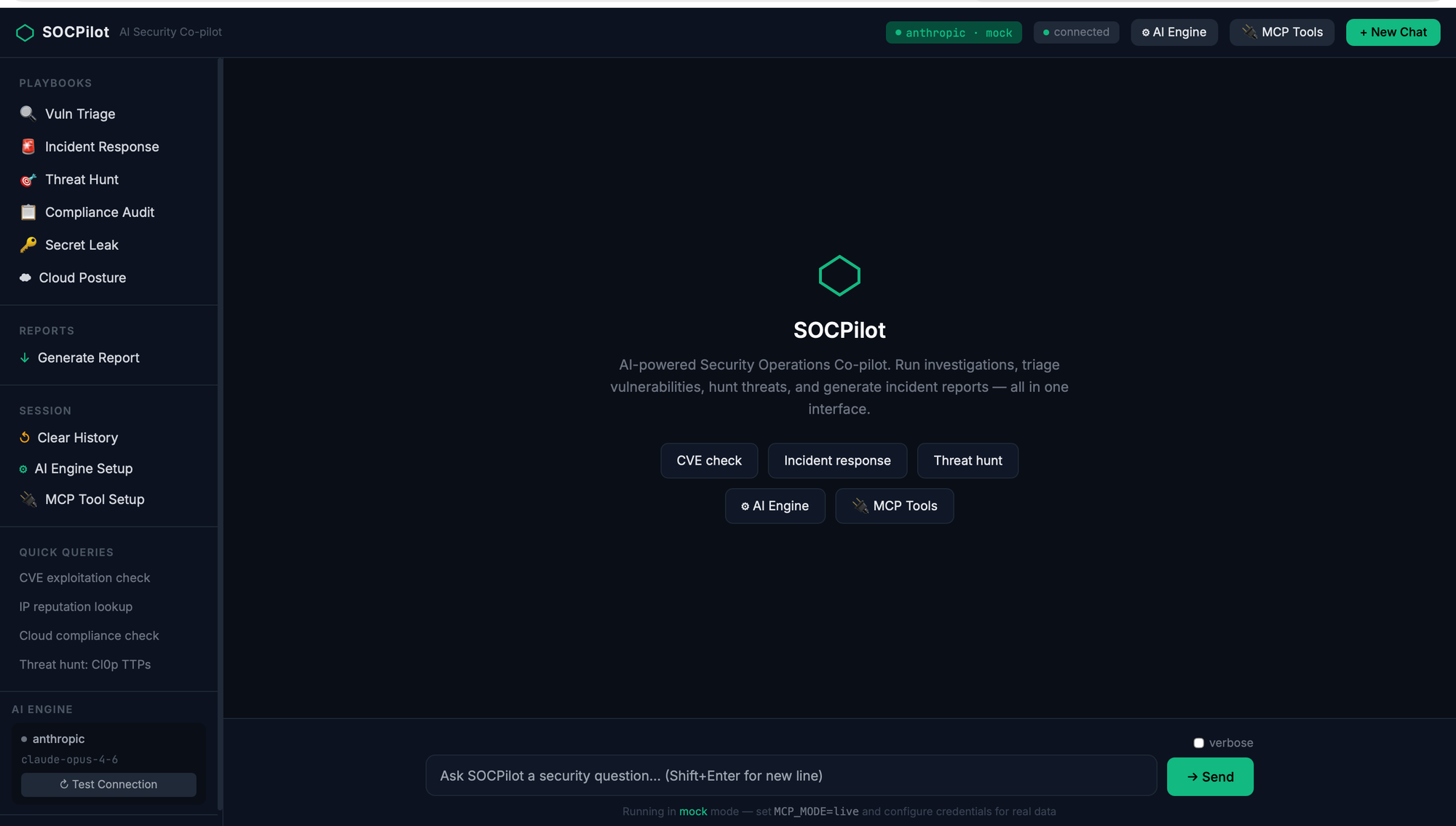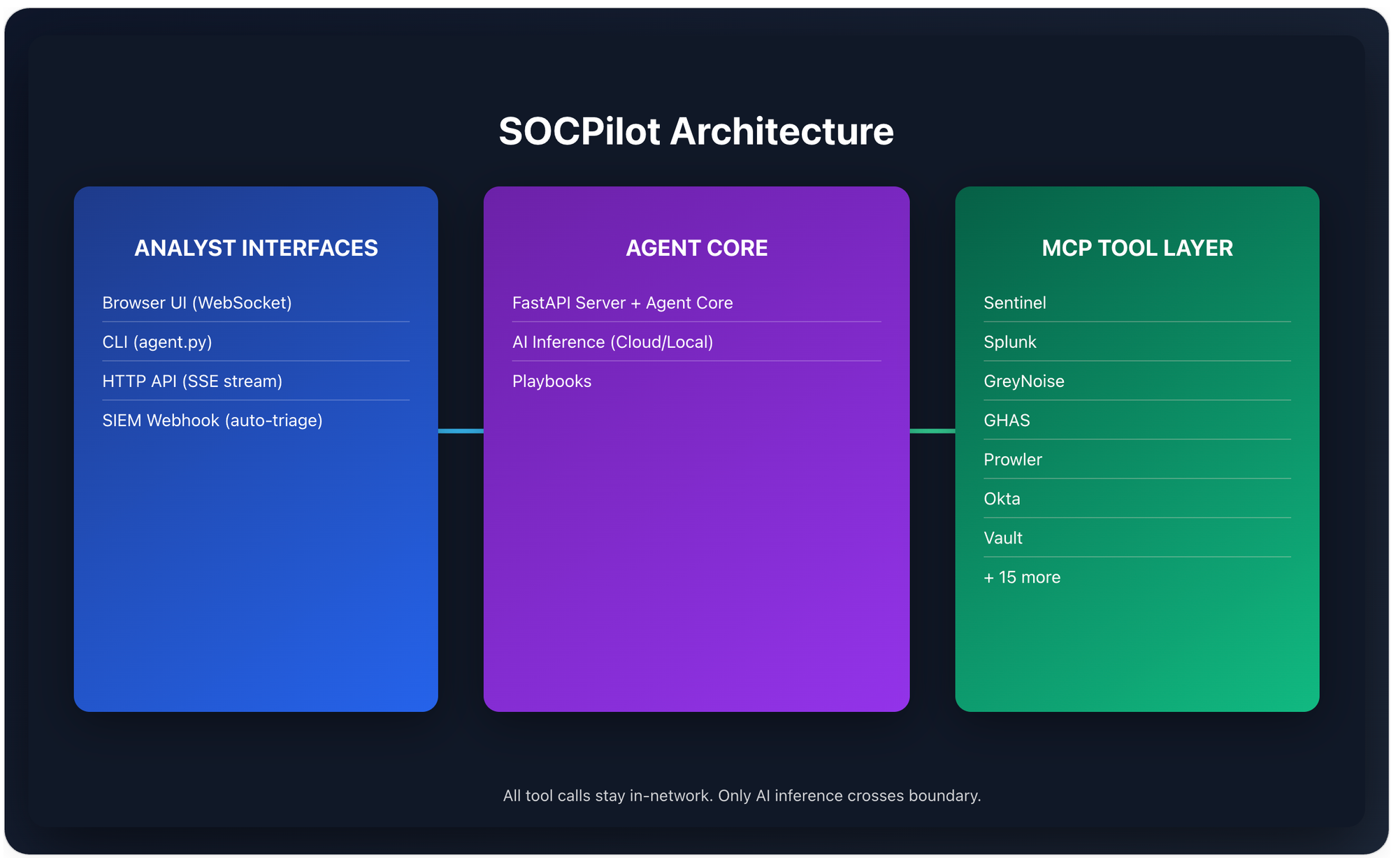 SOCPilot is the answer to that. It's an open-source AI security operations agent that wires 22 security tools into one investigation interface — CLI, HTTP API, or a browser-based chat UI — using MCP (Model Context Protocol) as the glue. Every MCP tool call stays inside your network. Only AI inference crosses the boundary. And you can test the whole thing in mock mode without a single API key.