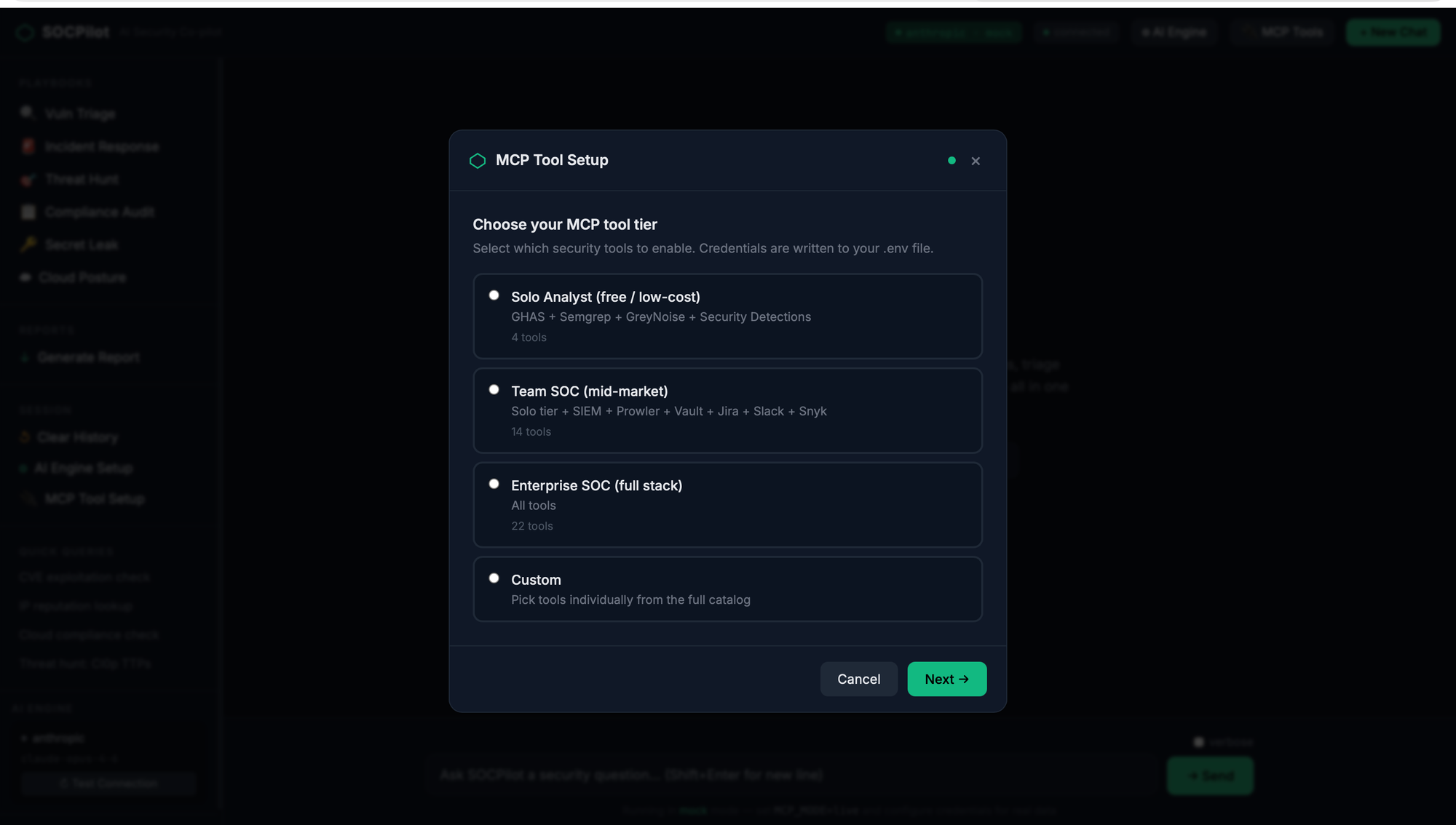 This is where it gets interesting. The tool onboarding wizard lets you configure which security tools SOCPilot connects to, with four deployment tiers: